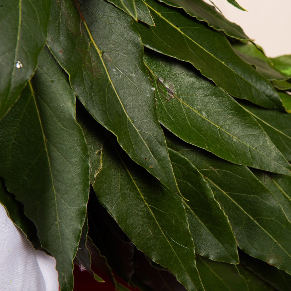 Na zona das mangas e da gola, optou-se pela utilização de folhas de louro, um elemento natural associado à proteção, à vitória e à tradição. O louro estabelece uma ligação direta à herança cultural das Fogaceiras, reforçando o carácter simbólico do traje.