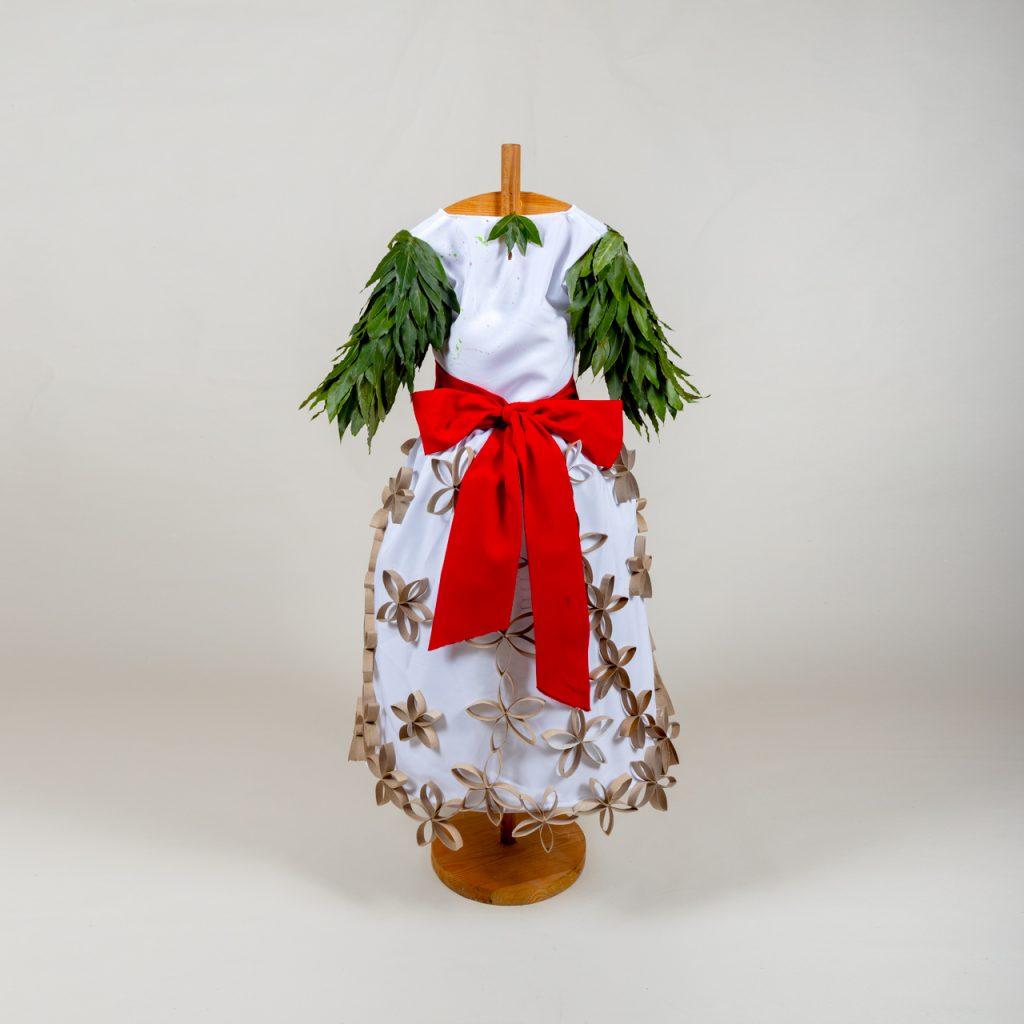 A combinação do papel reciclado com elementos naturais reflete uma abordagem sustentável e artística, onde o respeito pelo ambiente se alia à preservação da identidade cultural, resultando num traje expressivo, equilibrado e cheio de significado.