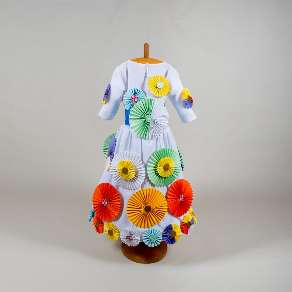 O vestido apresentado inspira-se no traje tradicional das Fogaceiras, respeitando a sua simbologia e identidade. Confeccionado em tecido branco, de linhas simples, com mangas compridas e saia rodada, evoca pureza, devoção e solenidade. A faixa azul na cintura reforça a ligação à tradição. As rosetas circulares em cartolina plissada, aplicadas manualmente em cores suaves, introduzem ritmo e expressão artística, simbolizando festa, união e criatividade comunitária.